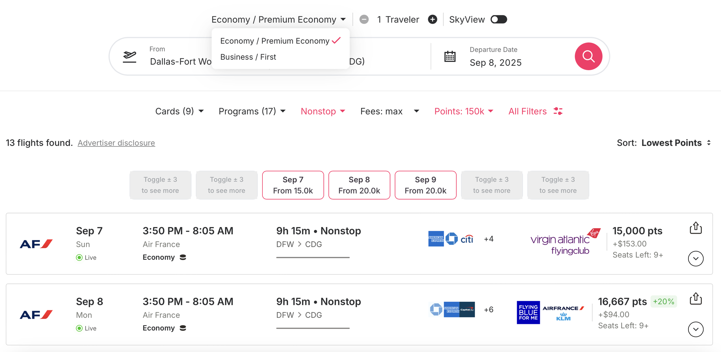 SkyView quickly pulled up multiple options for our fall trip to France! 🇫🇷 We can even filter the results down further if we would like to search for nonstop routes, or if we have a points budget, we can filter out any routes that are out of our desired range.