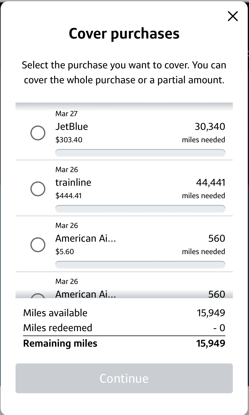 *Here you can see which of my recent purchases are eligible to be covered with my miles:
