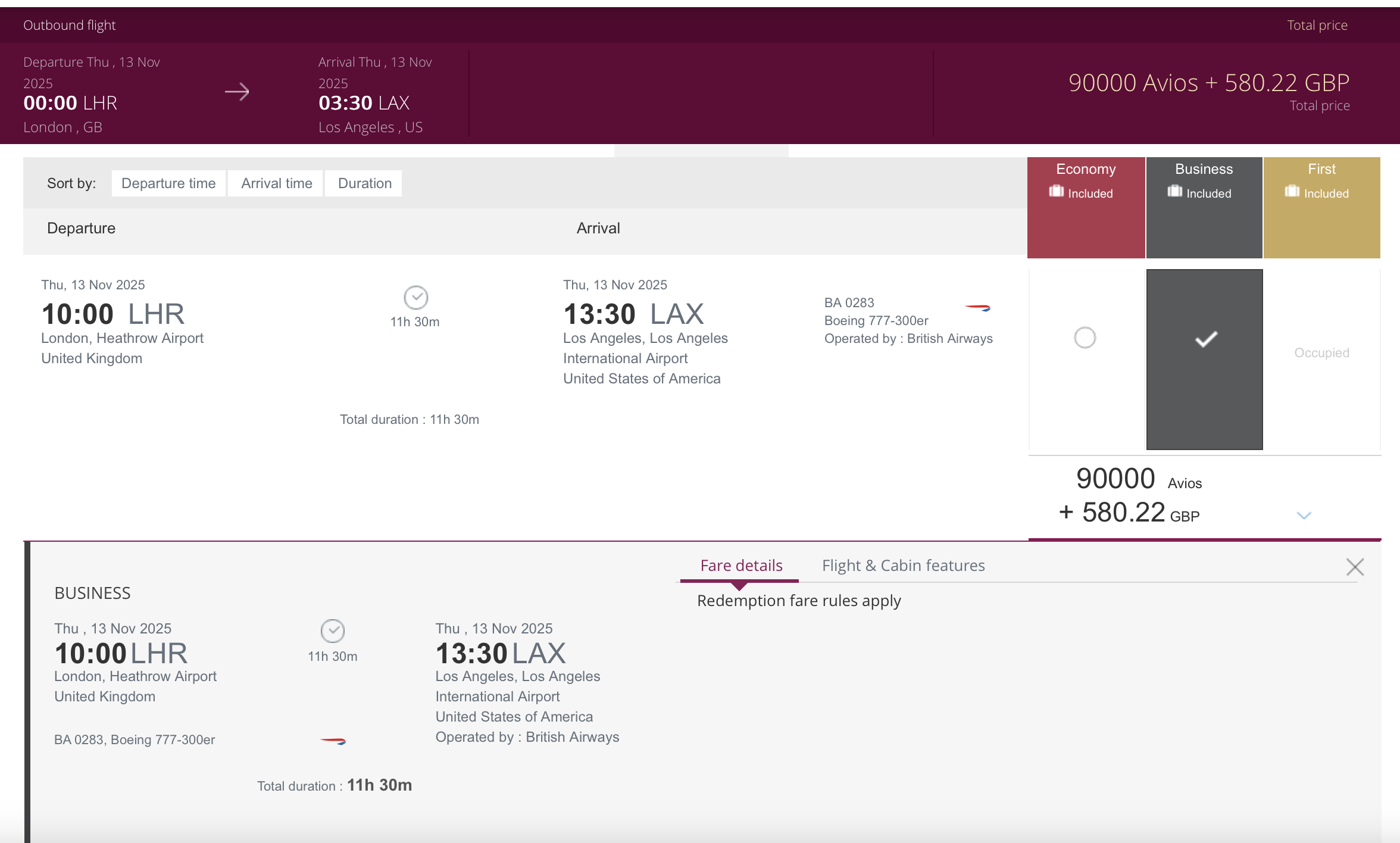 This flight from London (LHR) to Los Angeles (LAX) is offered by British Airways and was bookable on their site for 90,000 Avios and $475 in taxes and fees.