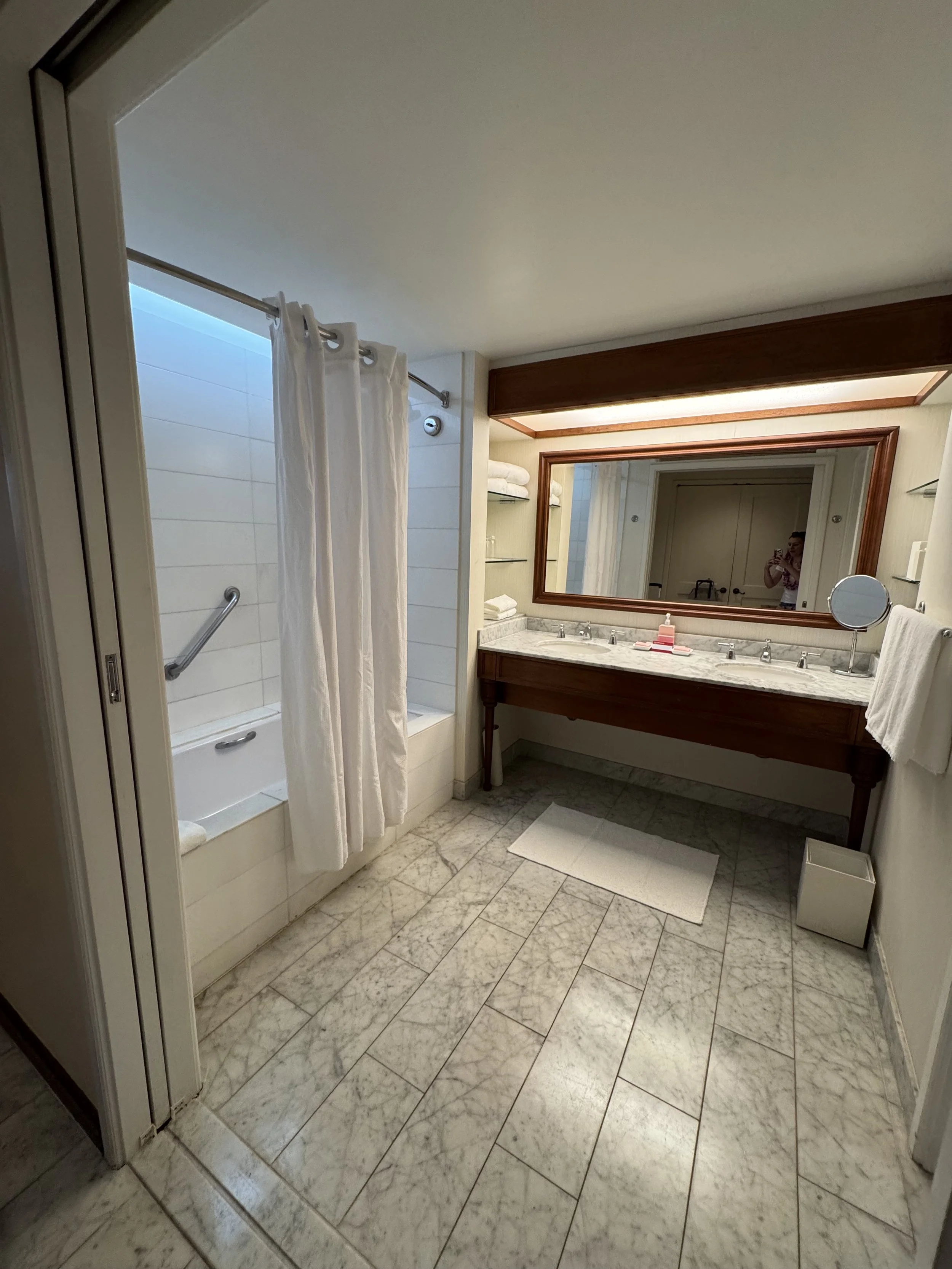 The beds were comfy, we loved the balcony off of our room with a view of the mountains, and we didn’t feel squished into the room which was nice! There was a fairly standard bathroom with a tub/shower combo, two sinks, and the toilet was behind a separate door.