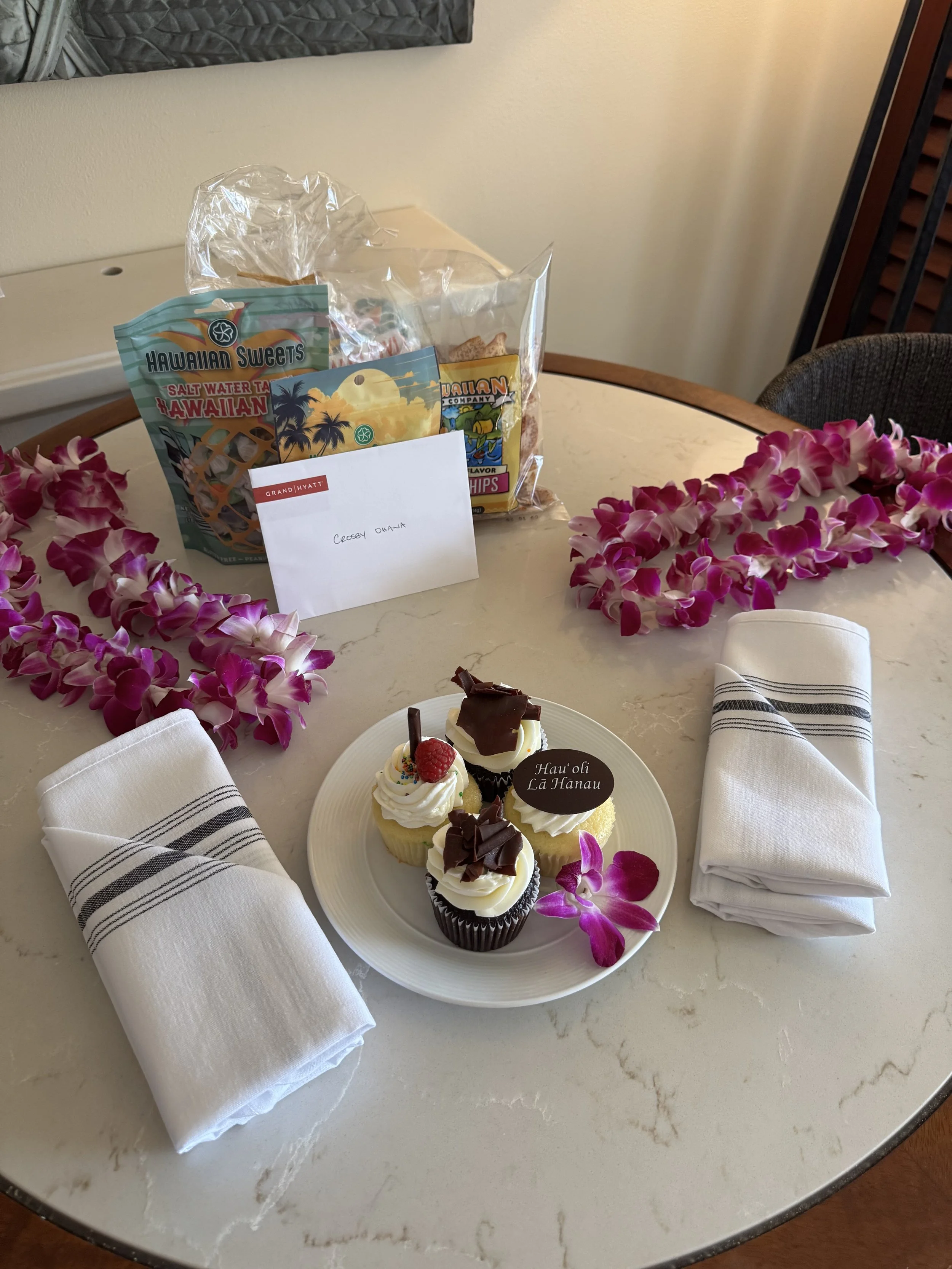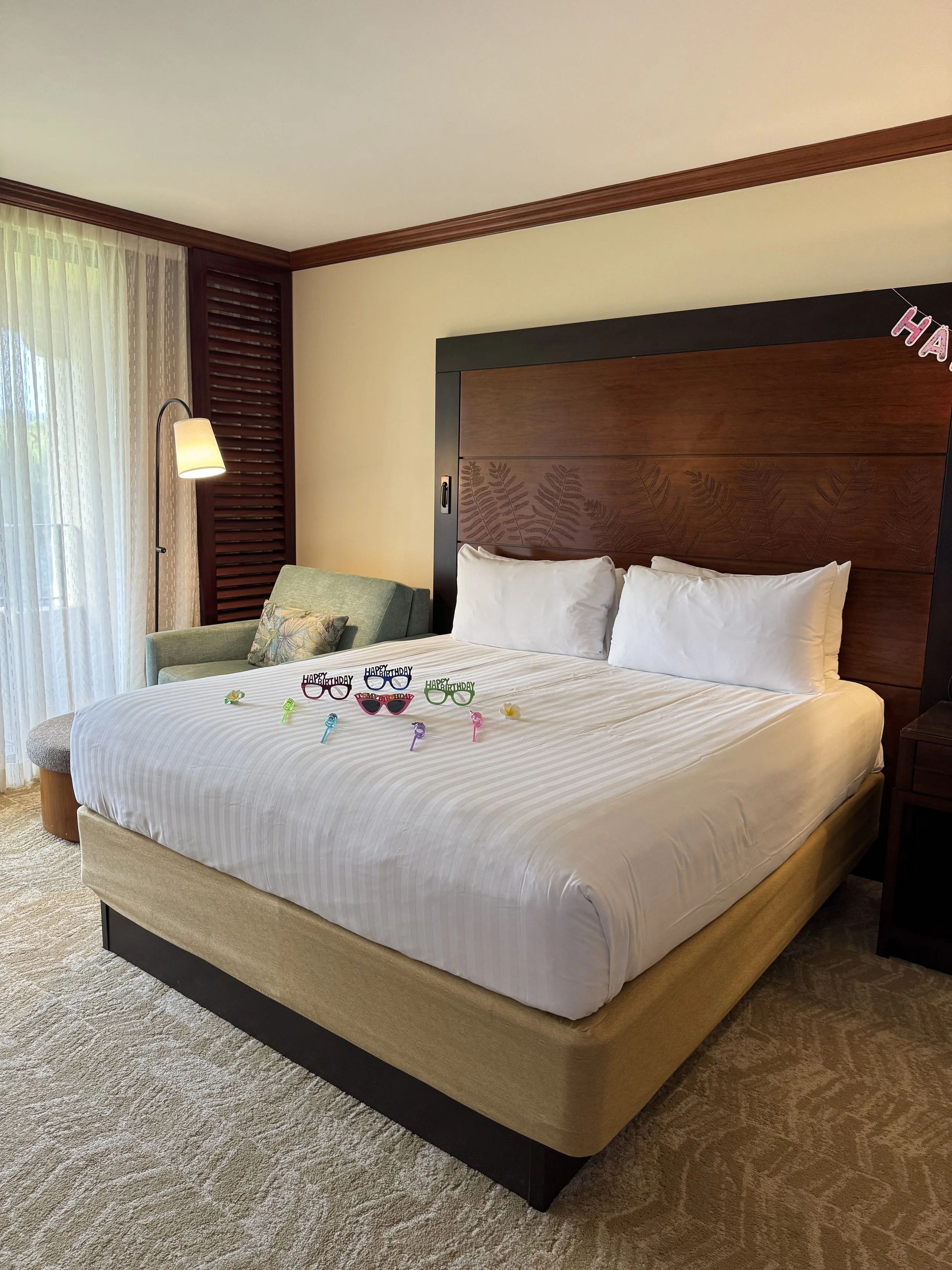 We walked in to find the sweetest welcome from the hotel. I had sent an email to the hotel a week before arriving to let them know that we were coming to celebrate our daughter’s birthday, and they had decorated the room for her and left a ton of treats and Hawaiian snacks for her! It was such a nice touch and she felt so special. 🥰