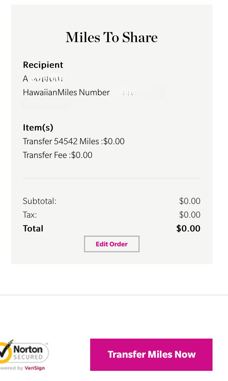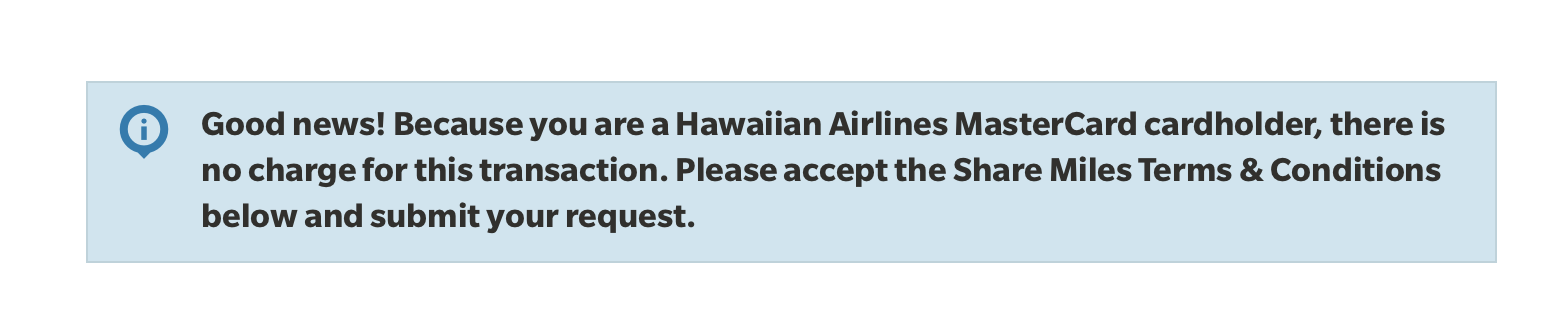 Transfers can be made from one HawaiianMiles account to another easily from your online account. These transfers are free if you are a Hawaiian Airlines cardholder, so that's a great perk! I got this pop-up message when transferring the points from my husband’s account to mine (we each have the Hawaiian Airlines® World Elite Business Mastercard®).