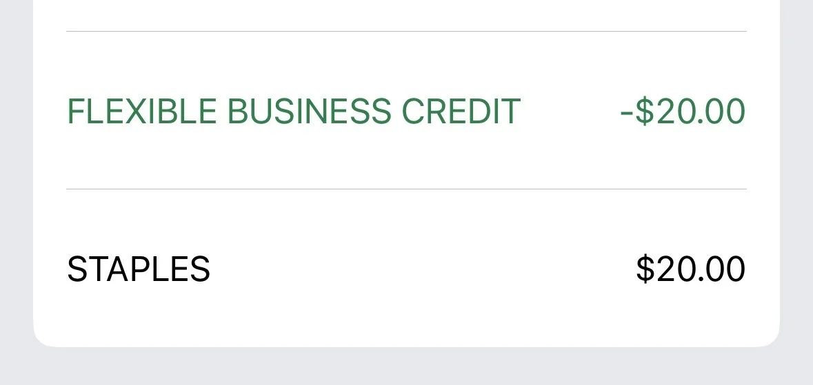 American Express® Business Gold Card: we both used our $20 monthly Flexible Business Credit to purchase items at Staples, and then we will get the credit back after making the purchase on our card. This credit can be used at FedEx, Grubhub, or office supply stores.